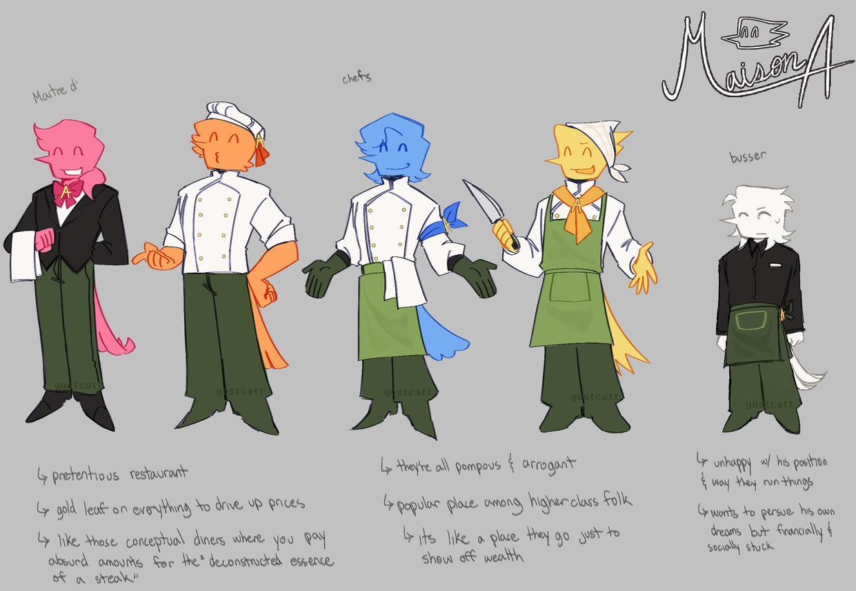 Spamton was stuck in a dead end position working with the Addisons. Bitter resentment building up and desperation for a way out increasing with each passing day.With no-one willing to pay any mind to his baking, he started frequenting the local park to feed the birds instead. A murder of crows, at least they appreciated his work. And appreciate they did, a crow with odd eyes gave back a gift; a dessert recipe.Spamton gave the recipe a try, discovering it to be the best thing he's ever made. He returned to the crows with the dessert as a thanks. To his surprise, the exchanges continued.The couriers offered him a way out, leading him to a cafe on the other side of town, where he met Tenna.